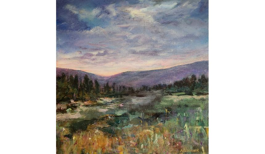 Landscape painting of mountains at dusk, evoking a sense of tranquility and the beauty of nature, in an impressionistic style with a focus on light & color, featuring blues, purples, greens, and hints of orange & pink. Sides are painted black, varnished, and wired ready to hang, with a signature on the bottom right corner.