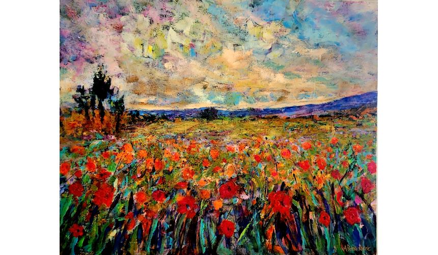 This gorgeous landscape painting depicts a field of vibrant scarlet poppies. Impressionist style with lots of texture, using dabs of color to capture the scene. vibrant red flowers, green and teal foliage, and a distant background of shades of blue. lilac & purple. Sides painted in neutral white, wired & ready to hang - signature on the bottom right corner.