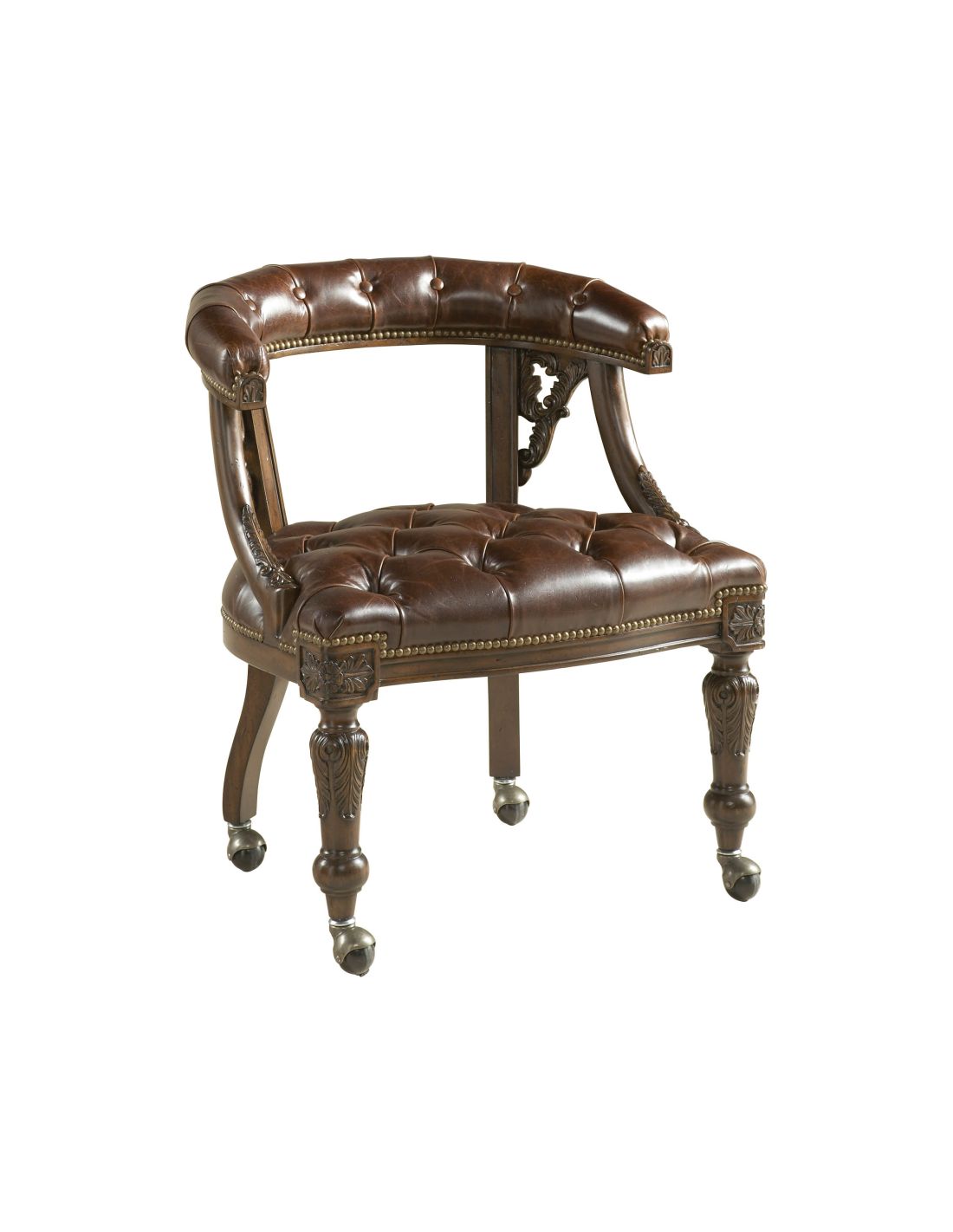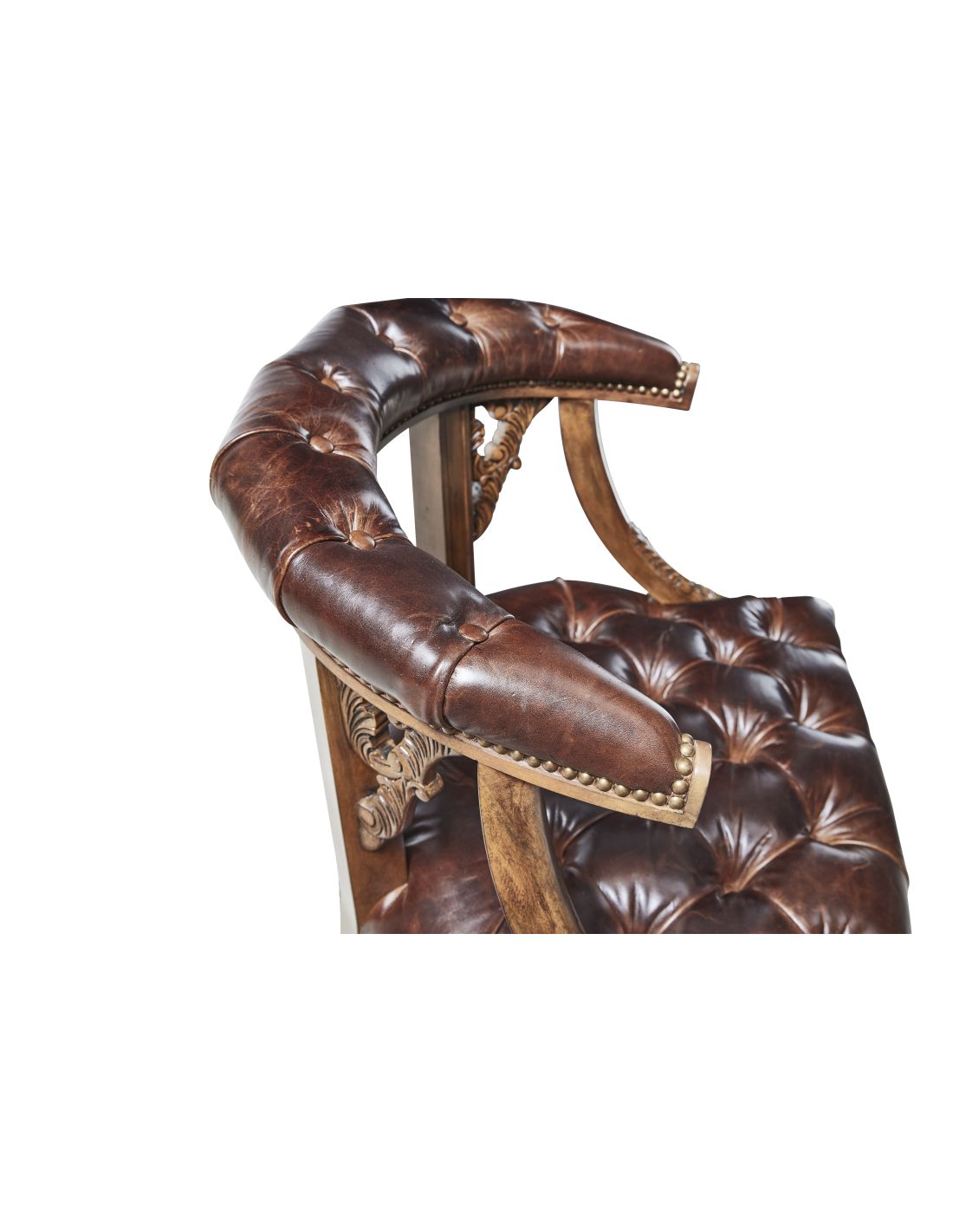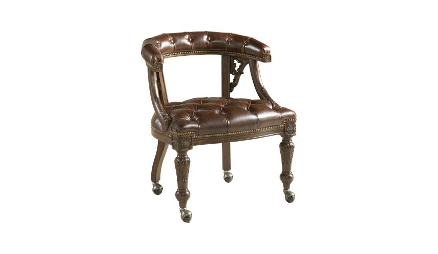 Carved brown finished game chair with briarwood leather upholstery and brass accents. Briarwood leather is a pull-up leather, which is subject to natural color variation.
