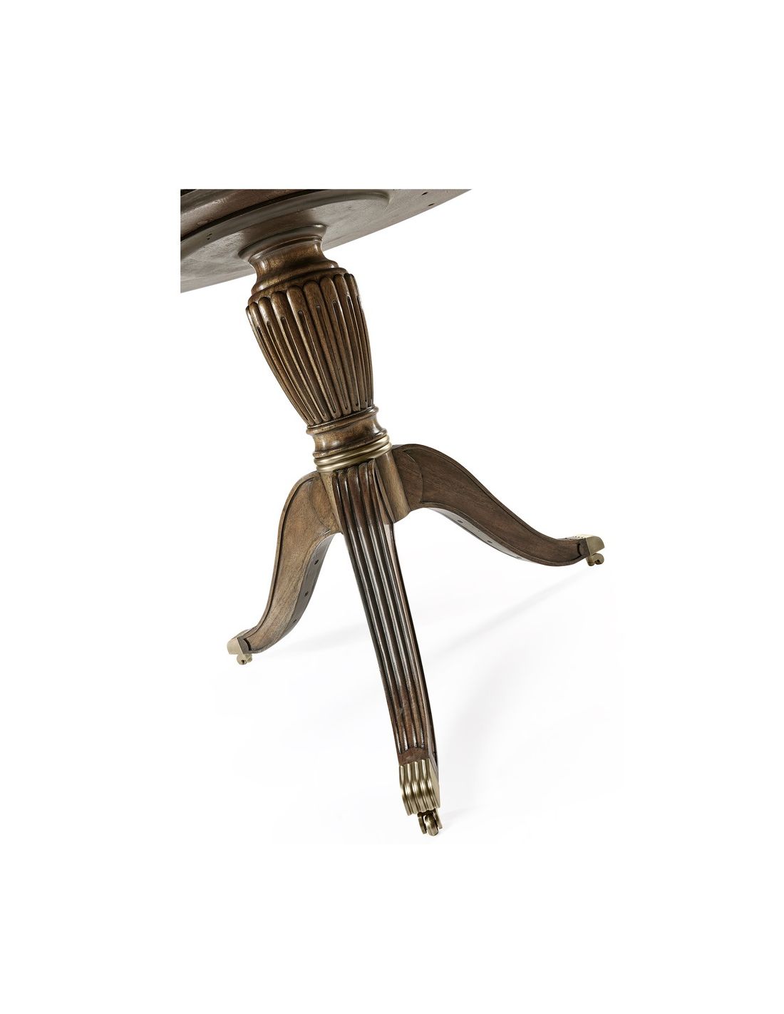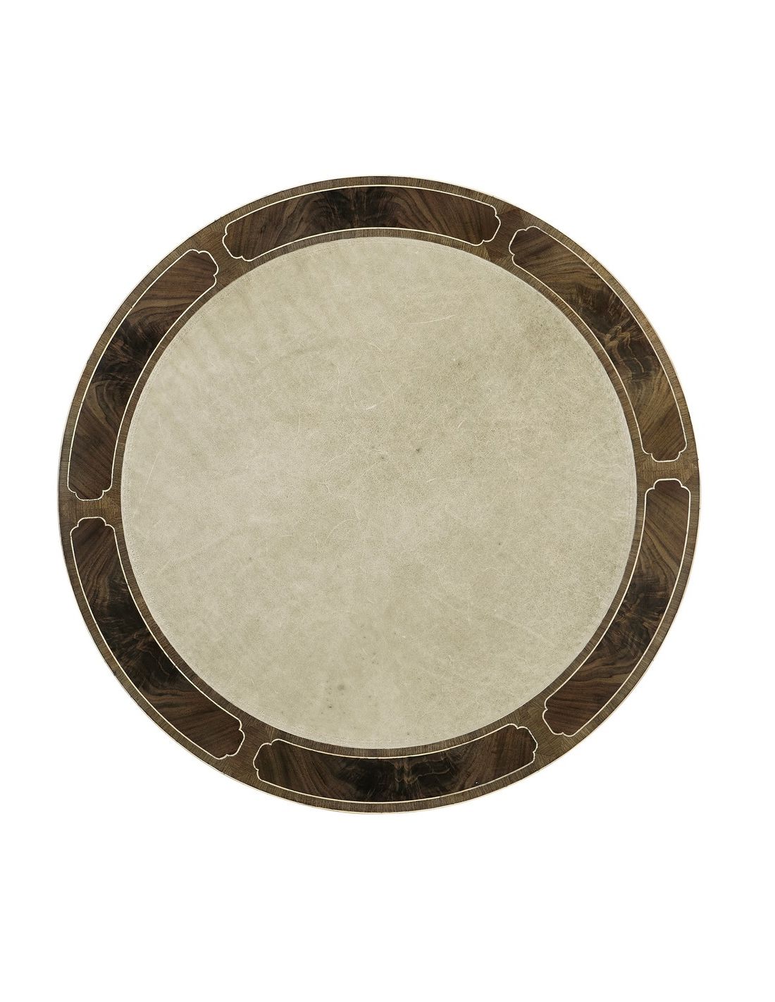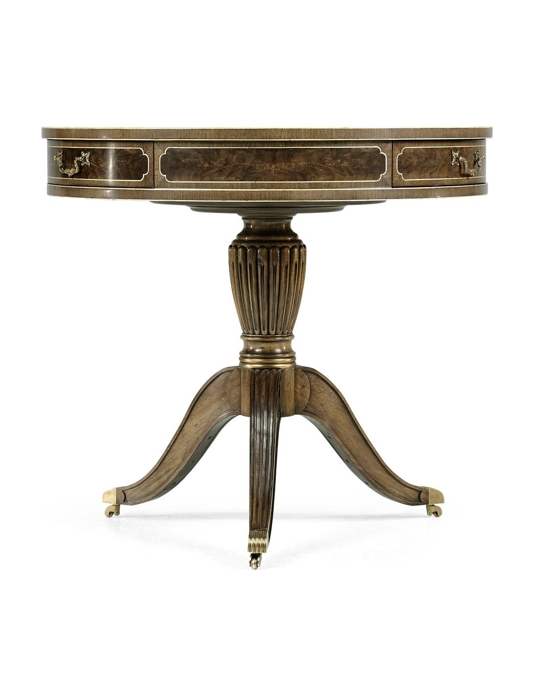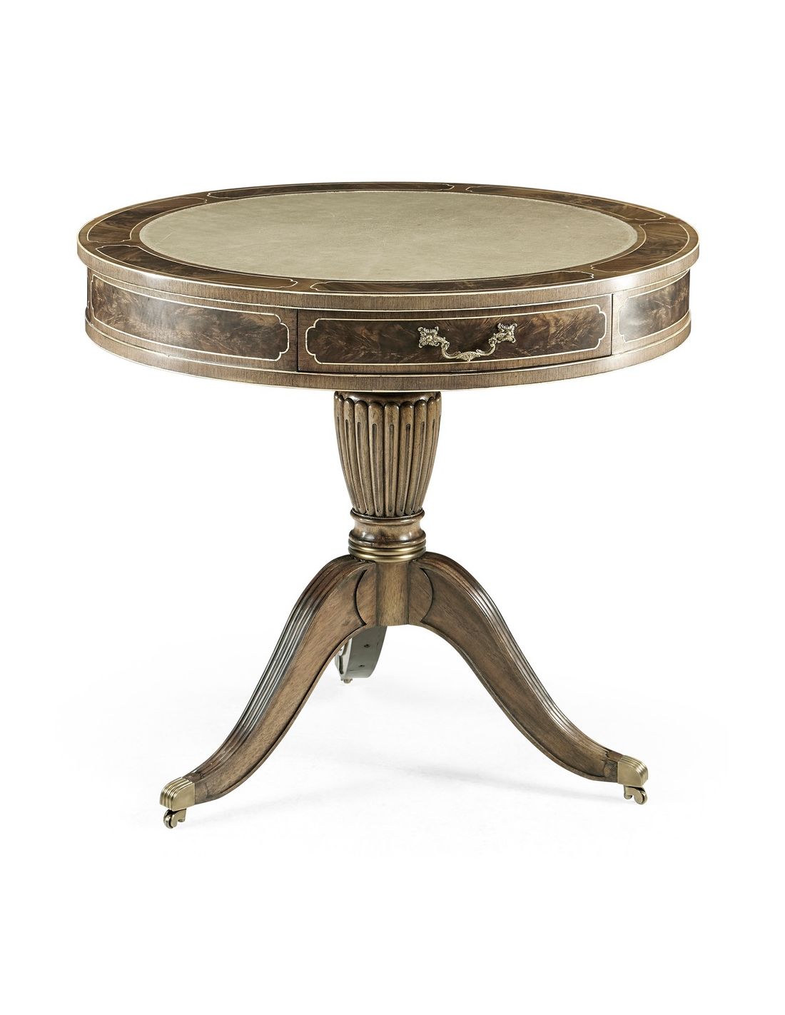 This formal drum table serves as a sophisticated accent piece for both sitting areas and living spaces. It features a circular hardwood top enveloped in mahogany crotch veneer, complemented by a leather inlay. The elegantly carved base, rests on three gently sloped legs, which conclude with castored feet.