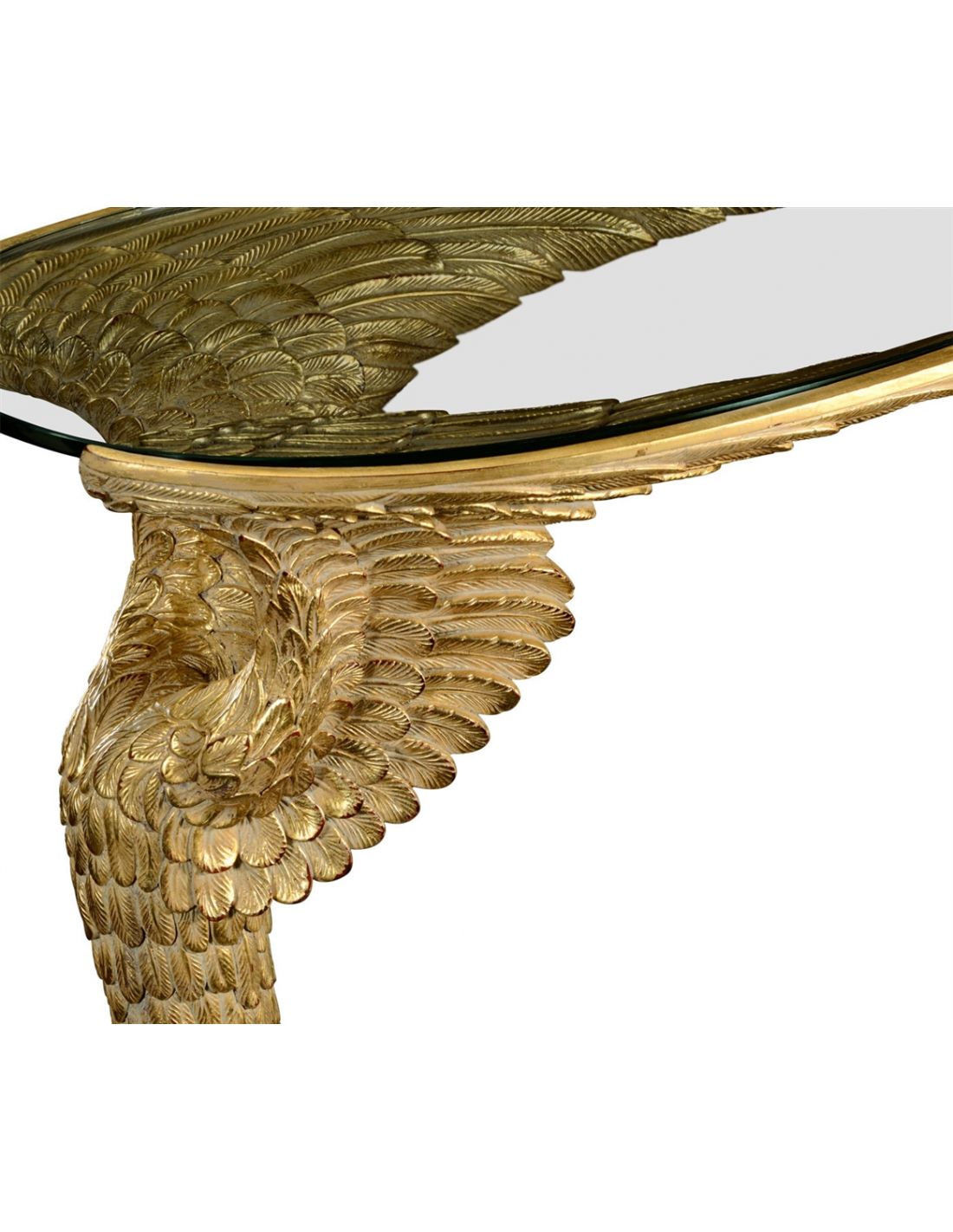 Spectacular finely carved and gilded sofa table inspired by early 19th century French Empire style furniture of a nationalistically modeled wing pedestal set on a black organically shaped base.