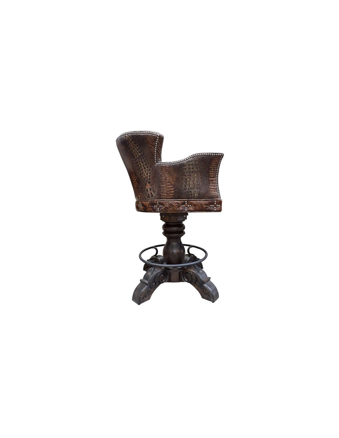 Whether it is at the kitchen bar counter or in your game room, spend time together with your family creating conversation and memories in this beautiful and comfortable handcrafted bar stool. Its seat and inside seat back are upholstered in rich, brown full grain leather, and the center of its inside seat back has a beautiful button tufted design. The reverse seat back and the front part of the armrest are upholstered in dramatic, textured, brown, embossed full grain leather. The entire base of the bar stool is decorated with Spanish colonial style crosses made with hand forged nails. All upholstery is precision hand tacked to the entire wood frame by our skilled craftsmen. The entire body is resting on a strong hand turned wood trumpet pedestal that is supported by four hand carved wood feet, and joined by a hand forged circular footrest. Both beautiful and durable, it is made of the best wood available. It swivels 180° and is 100% customizable.