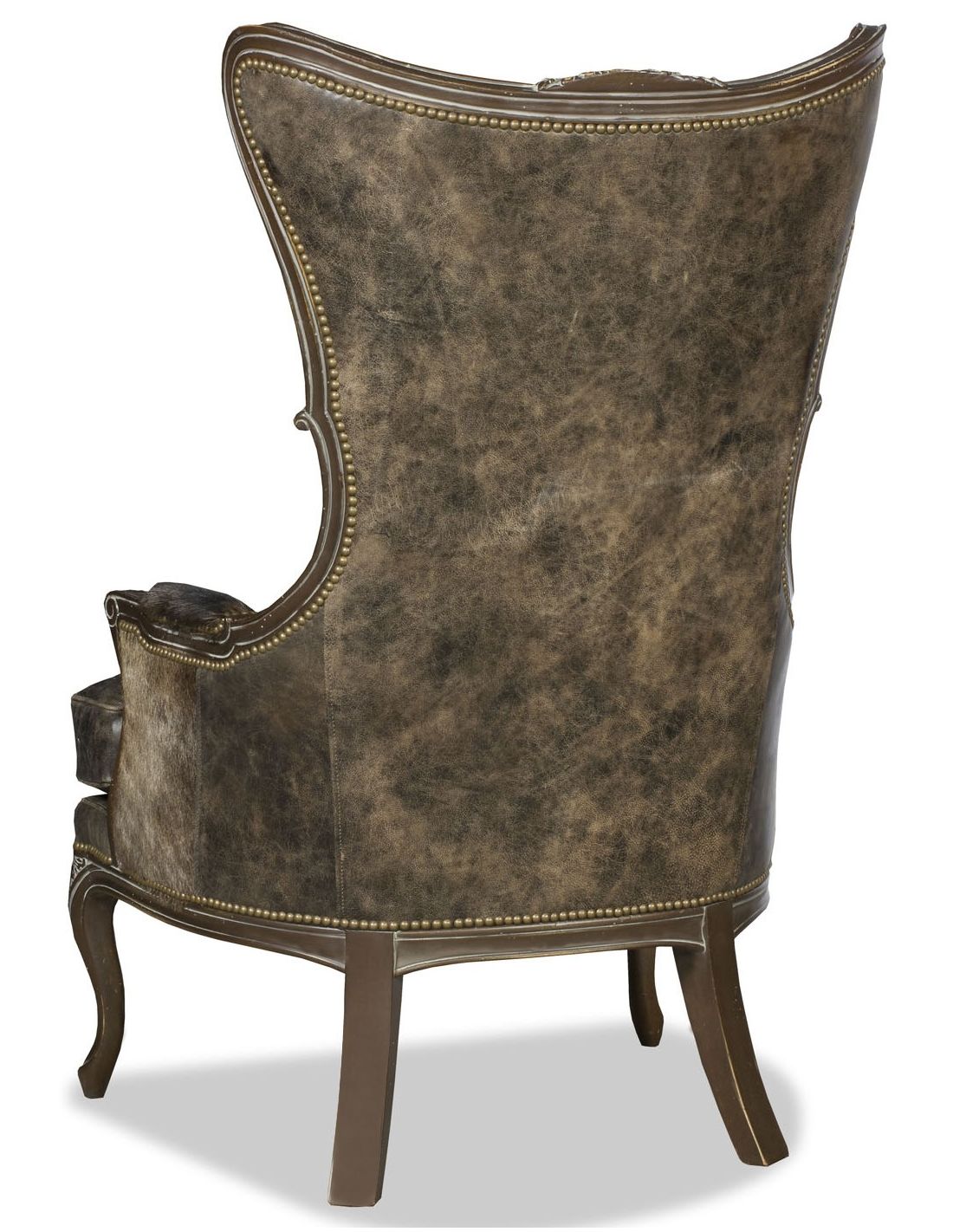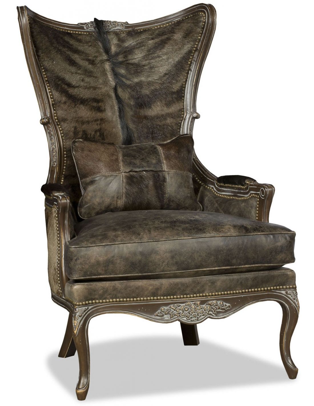 Stunning western style wing backed chair covered in a luxurious combination of buttery leathers and unique animal prints.
