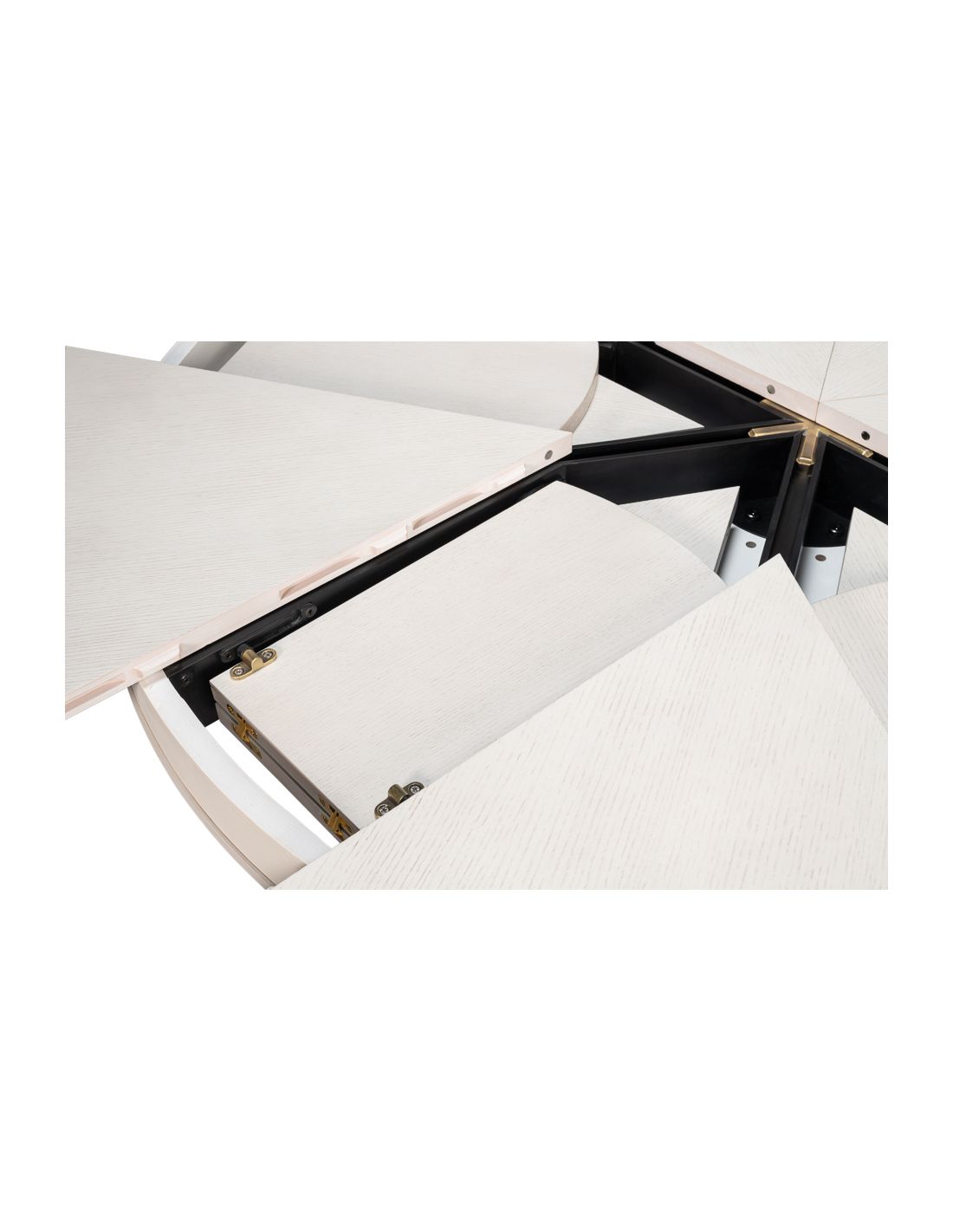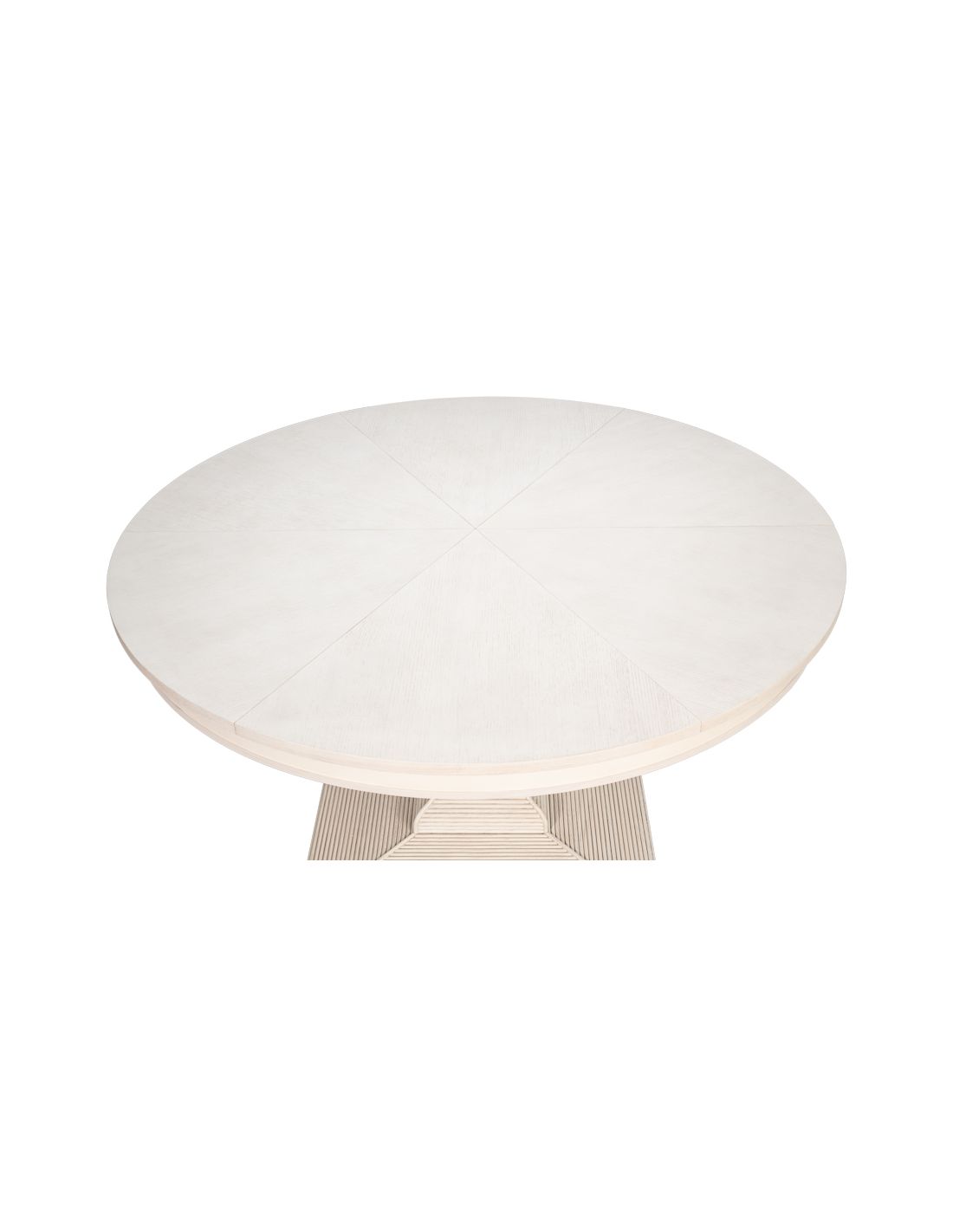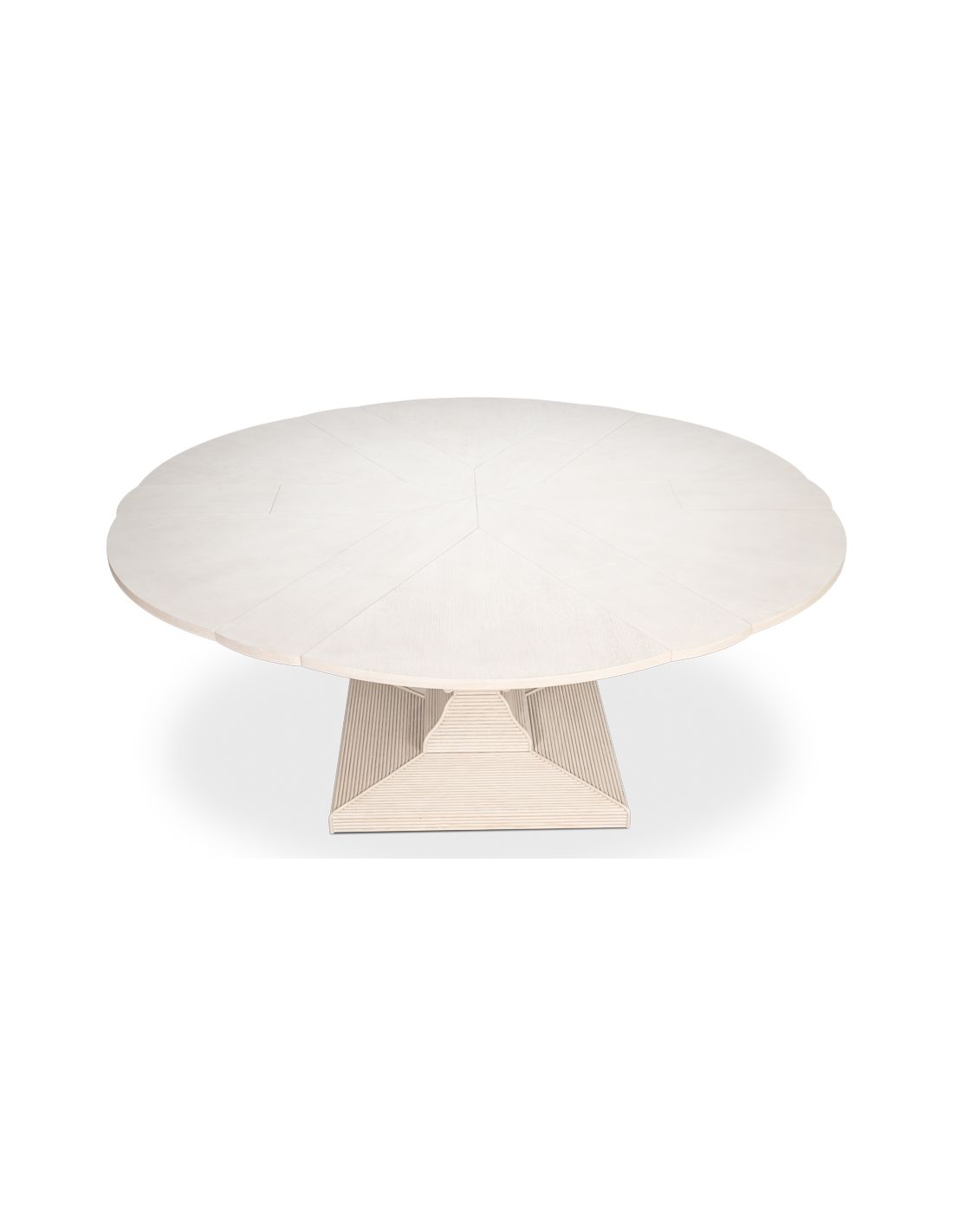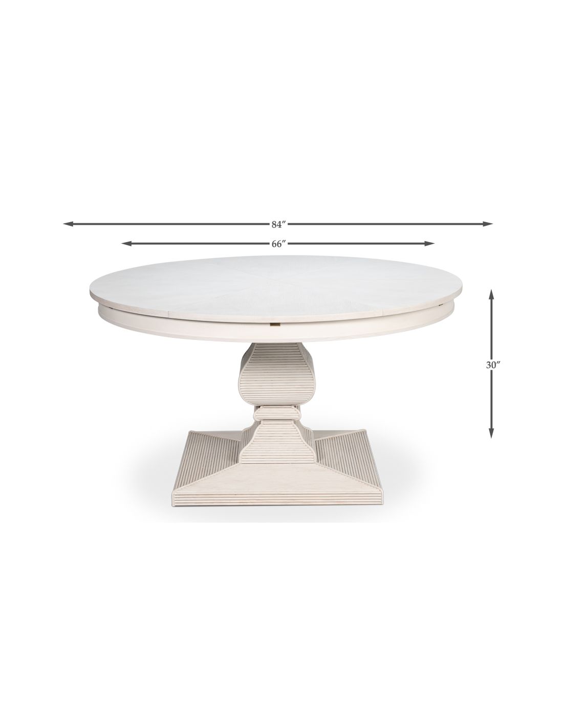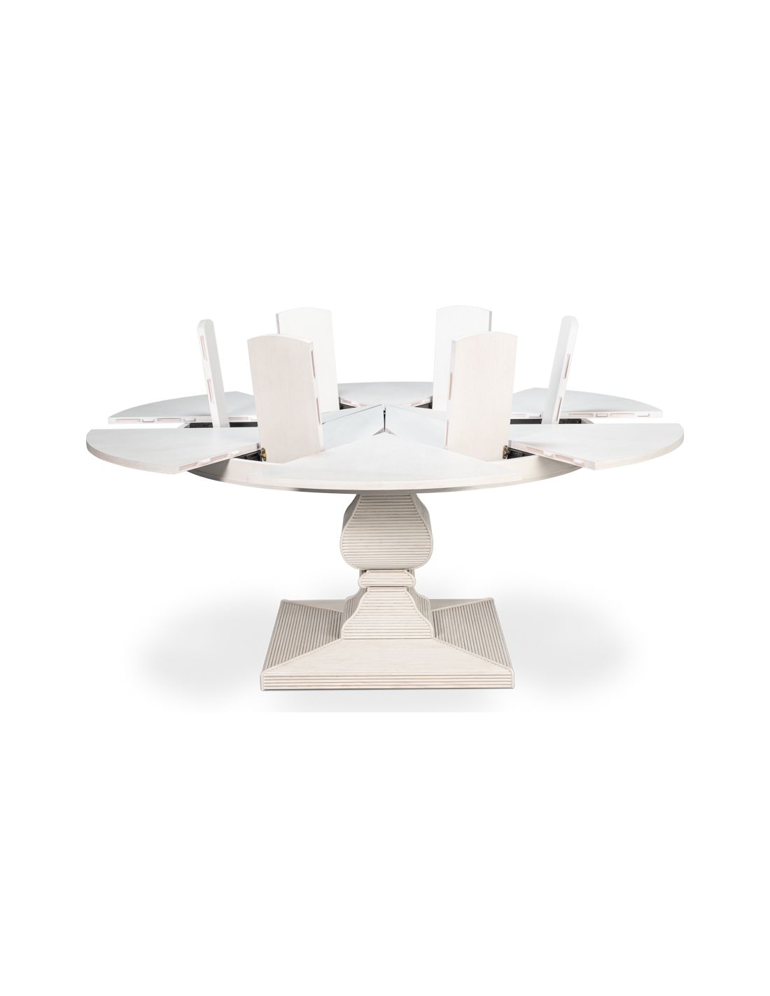The Equestrian Jupe Table stands out with its classically designed reeded and hand-finished pedestal base, making it versatile enough to complement any style. Featuring a self-storing expansion mechanism crafted from extruded aluminum, the top expands easily, ensuring smooth operation and simple assembly.